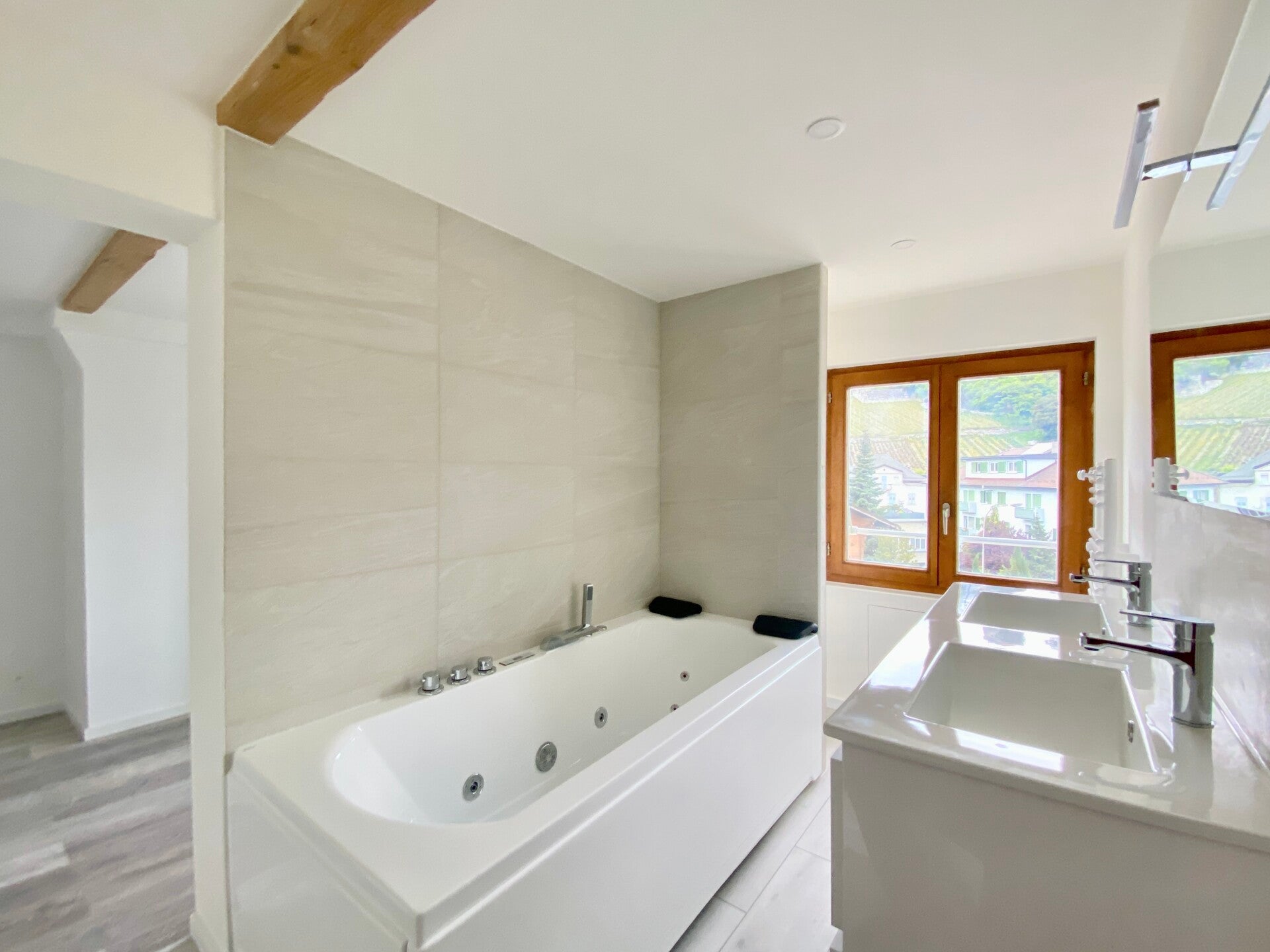 Rénovation intérieure à Sierre (VS) – redistribution des pièces et création d’une salle de bain balnéo moderne avec baignoire hydromassante.