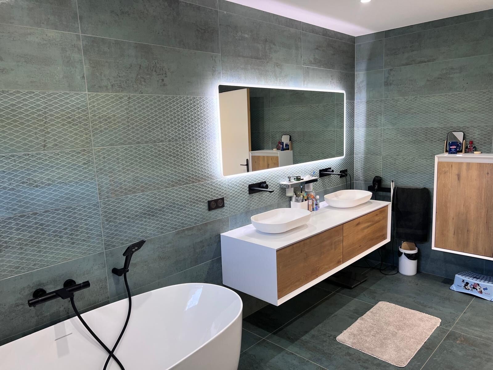 Salle de bain moderne à Salon-de-Provence – double vasque suspendue, baignoire contemporaine et finitions haut de gamme.