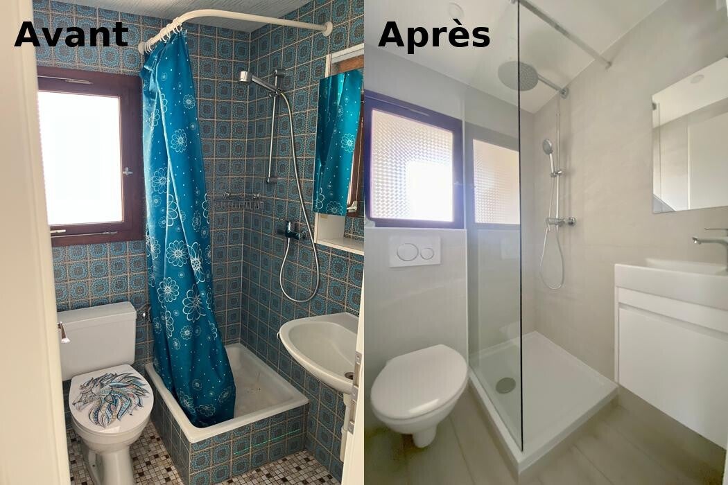 Transformation d’une salle de bain à Lambesc avec douche à l’italienne moderne et sol vinyle décoratif type carreaux de ciment.