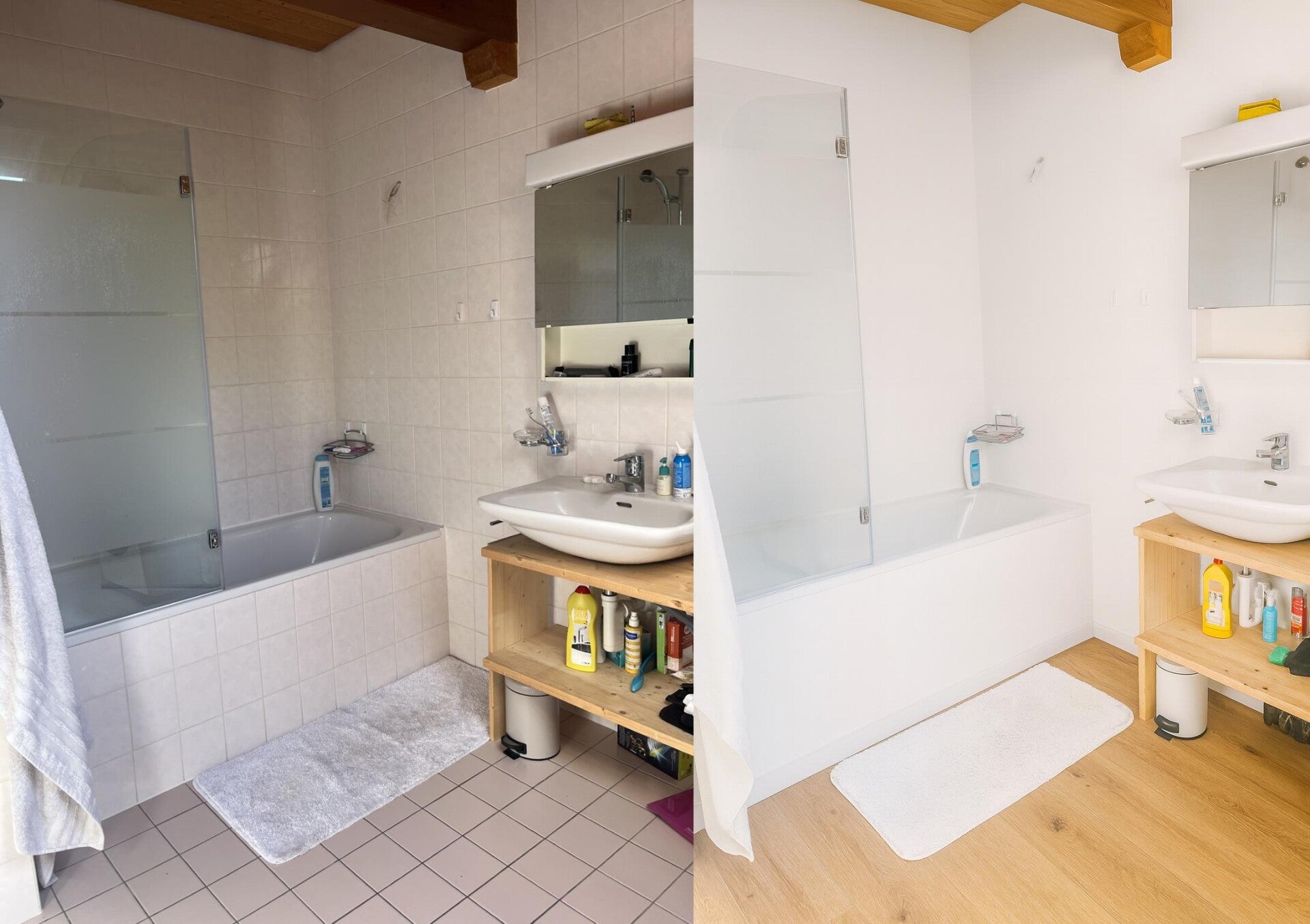 Transformation d’une salle de bain à Cossonay : simulation IA avant travaux et rendu final pour un espace moderne, lumineux et chaleureux.