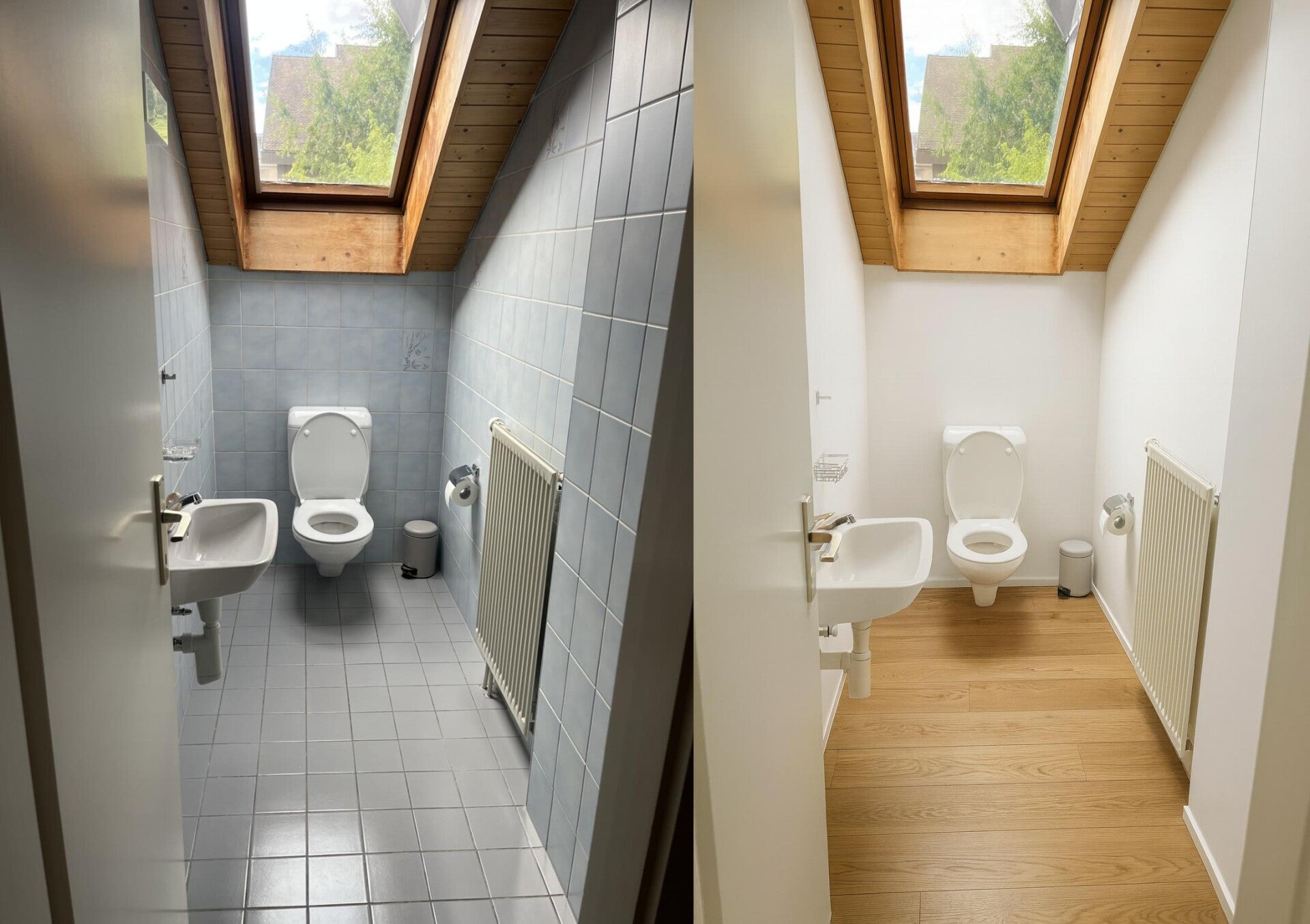 WC rénovés à Cossonay – peinture sur carrelage, rafraîchissement complet et installation d’un sol stratifié pour un rendu moderne et lumineux.